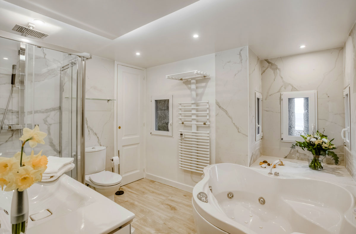 Tout le confort sanitaire et même une baignoire balnéo.