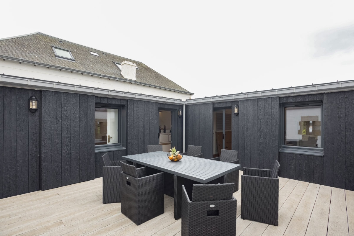A l’abri des regards grâce aux meurtrières ouvrant sur la mer et la campagne, équipée d’une jolie table et de huit fauteuils.