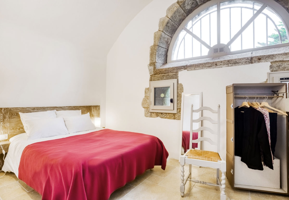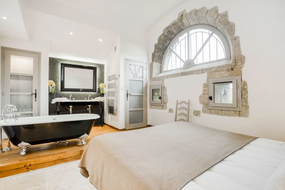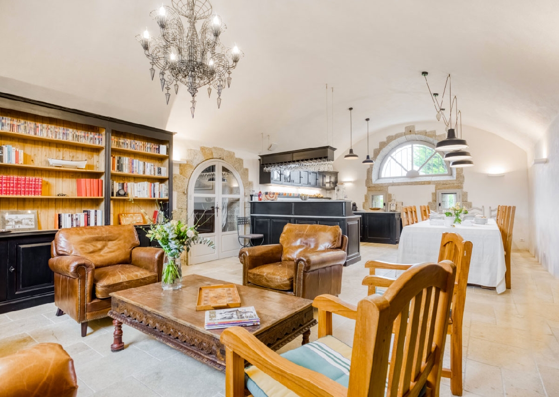 Après avoir passé le pont-levis, une double porte s’ouvre sur un hall desservant une arrière-cuisine, une buanderie, une suite parentale, une chambre, une immense pièce de vie avec son confortable salon, son grand espace repas/cuisine (table de salle à manger pour 14 convives).